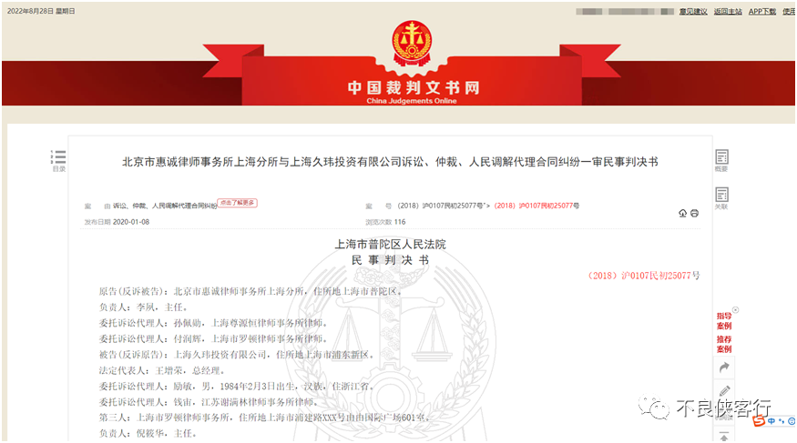 惠誠上海分所與委托人律師費(fèi)糾紛