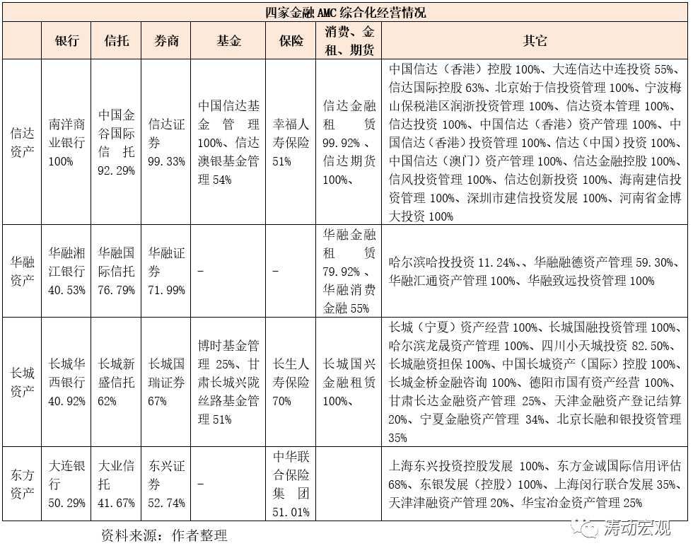 (2)1999年成立的四家金融AMC也已全部轉(zhuǎn)型為擁有各銀行、信托、券商、基金、保險(xiǎn)、消費(fèi)金融、金融租賃、期貨、資產(chǎn)管理、信用評(píng)級(jí)等各類金融牌照的金融控股集團(tuán),并廣泛涉足私募基金、房地產(chǎn)等業(yè)務(wù)。例如,信達(dá)資產(chǎn)擁有南洋商業(yè)銀行、金谷國際信托、信達(dá)證券、幸福人壽保險(xiǎn)和信達(dá)基金;華融資產(chǎn)擁有華融湘江銀行、華融國際信托、華融證券、華融消費(fèi)金融和華融金融租賃,長城資產(chǎn)擁有長城華西銀行、長城新盛信托、長城國瑞證券、長生人壽保險(xiǎn),東方資產(chǎn)則擁有大連銀行、大業(yè)信托、東興證券、東方金誠和中華聯(lián)合保險(xiǎn)集團(tuán)等。