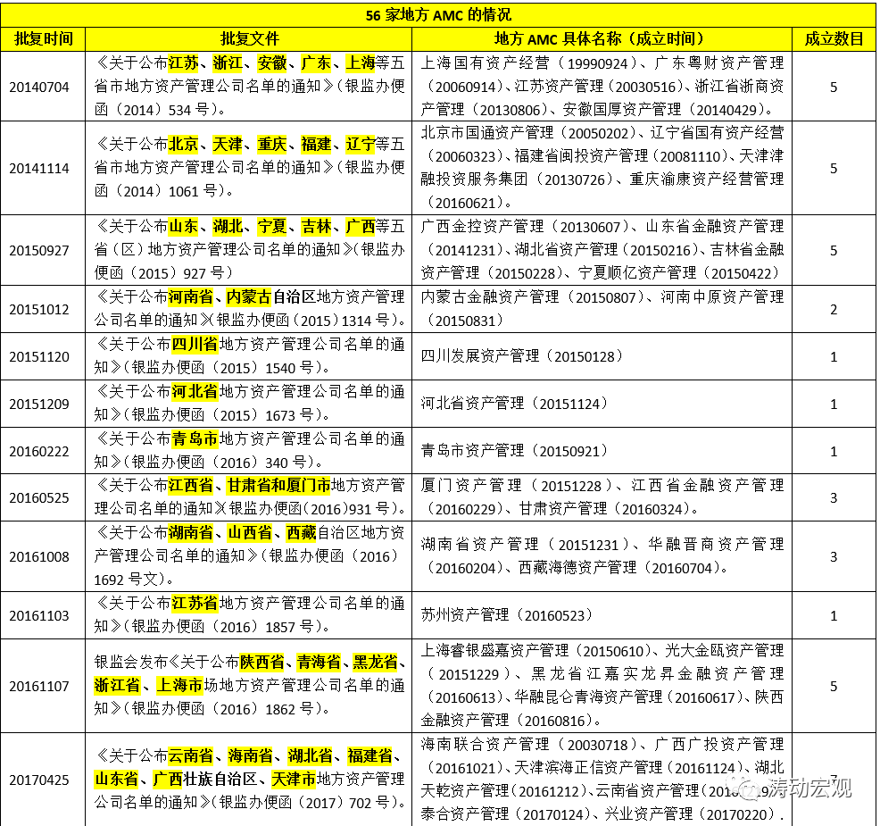 3、2017年的全國金融工作會(huì)議再次定調(diào)后續(xù)三年的基調(diào)是化解金融風(fēng)險(xiǎn)和嚴(yán)監(jiān)管,而帶化解金融風(fēng)險(xiǎn)天然職責(zé)的地方性AMC自然再到受到政策青睞,特別是2016年發(fā)布的1738號(hào)文明確提出各地可以視情況新設(shè)一家地方性AMC,使得2017-2018年兩年時(shí)間里合計(jì)批設(shè)21家地方AMC,使我國地方性AMC數(shù)量增至52家。