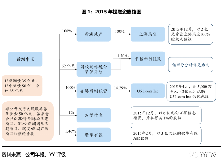 2015年,公司融資端有息債務增加70億元,包括當年新發行的15新湖債和15中寶債合計85億元;另外非公開發行股票50億元。帶來的資產端變化包括:(1)其他應收款增加17億元,新增的部分主要是與香港新湖9億元和與上海瑪寶7.2億元的往來款;(2)可供出售金融資產增加57億元,資金投向包括境外資管計劃62億元、萬得信息6億元、51信用卡3億元、歌華有線3億元和中信銀行1億元;(3)長期應收款增加24億元,具體未披露明細,但根據合并報表中長期應收款余額為0可推測該筆為集團內部往來款;(4)長期股權投資增加7億元,主要為權益法核算下的正常變動,但其子公司新湖地產在2015年12月以2億元收購了上海瑪寶。綜合來看,2015年新湖中寶債券融資85億元,新增金融投資75億元,考慮付息情況等變化,幾乎所有的債券融資都投向了投資板塊。