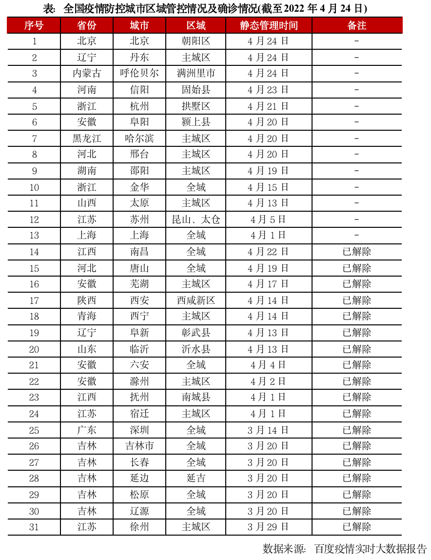 3月以來,超過30個城市緊急發布靜態管理疫情防控公告,其中,蘇州、太原等城市僅在疫情高發的重點區域實行管控,而上海、深圳、長春等實行全域靜默管理,期間全城非必要經營活動暫停,房地產市場也因此幾乎陷入停擺。截至4月24日,仍有13個城市處在局部或全域靜態管控當中,全國尚存在111個中高風險地區。