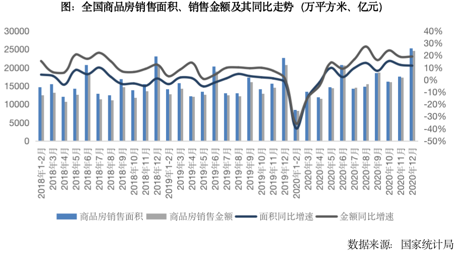 下半年房地產市場加速轉暖,單月銷售面積同比增速在10%左右,助推全年行業規模再創新高。2020年,全國商品房銷售面積17.6億平方米,同比增長2.6%,銷售金額17.4萬億元,同比增長8.7%,銷售規模如期再創歷史新高。尤其是東部地區房地產市場強勁復蘇,全年銷售表現亮眼,商品房銷售規模同比增長7.1%。