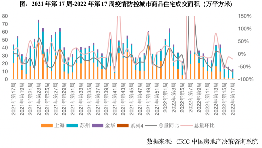 第17周,3個尚在靜態管控中的城市,新房成交面積共計13萬平方米,僅為2022年周平均規模的1/3,環比下跌20%,同比跌幅擴大至71%。