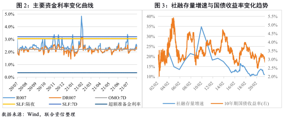 7月政治局會(huì)議較4月的政治局會(huì)議刪除了“不急轉(zhuǎn)彎”的表述,但同時(shí)強(qiáng)調(diào)“要做好宏觀政策跨周期調(diào)節(jié)”,會(huì)議強(qiáng)調(diào)“穩(wěn)健的貨幣政策要保持流動(dòng)性合理充裕,助力中小企業(yè)和困難行業(yè)持續(xù)恢復(fù)”,與7月初國(guó)常會(huì)議表示對(duì)中小企業(yè)支持態(tài)度相一致,疊加當(dāng)前MLF存量為歷史最高值,因此下半年不排除通過(guò)降準(zhǔn)置換MLF的方式推動(dòng)銀行端負(fù)債成本下降以達(dá)到降低中小企業(yè)融資成本的目的。結(jié)構(gòu)性信用寬松政策疊加政府債發(fā)行,或?qū)?dòng)下半年社融存量增速觸底反彈。從圖3可以看出,社融存量增速與國(guó)債收益率走勢(shì)相關(guān)性較高,且領(lǐng)先十年期國(guó)債收益率,因此同樣支持短期內(nèi)國(guó)債收益率下行,但長(zhǎng)期走勢(shì)還需要進(jìn)一步確認(rèn)基本面走勢(shì)。