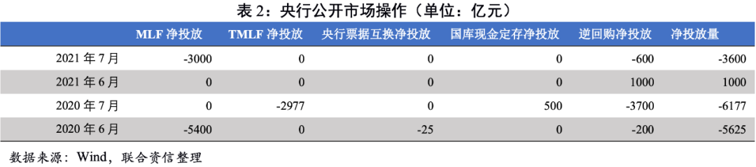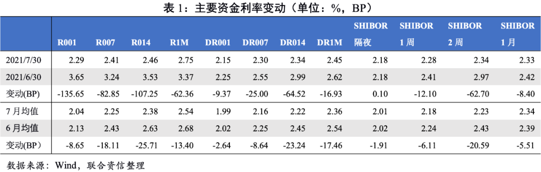 7月資金面相對(duì)較為寬松,主要資金利率月度均值全面下行。全面降準(zhǔn)后,央行雖然并未降低MLF操作利率且縮量續(xù)作,共計(jì)釋放了7000億的流動(dòng)性。隨著銀行月末考核臨近,7月底資金利率有所上行,7月28日,R007和DR007分別升至2.60%和2.39%的月內(nèi)高點(diǎn),較去年同期有所提高,但低于2019年同期。