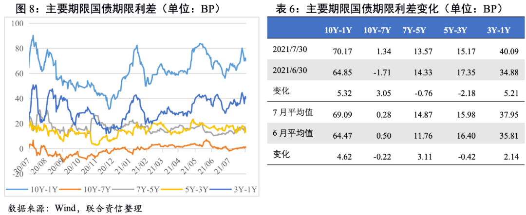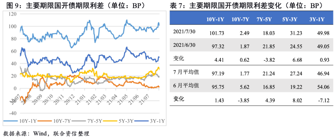 期限利差大多走闊。從期限利差均值來(lái)看,國(guó)債10Y-7Y和5Y-3Y期限利差均有所收窄,其余主要期限利差均有所走闊,表明短端利率受資金面影響下行更為顯著。國(guó)開(kāi)債主要期限利差中,10Y-7Y和3Y-1Y期限利差收窄,其余期限利差走闊。截至7月末,國(guó)債7Y-5Y和5Y-3Y期限利差有所收窄,國(guó)開(kāi)債7Y-5Y期限利差收窄。整體看,7月主要期限國(guó)債和國(guó)開(kāi)債期限利差較6月均有所擴(kuò)大,收益曲線較6月陡峭化。
