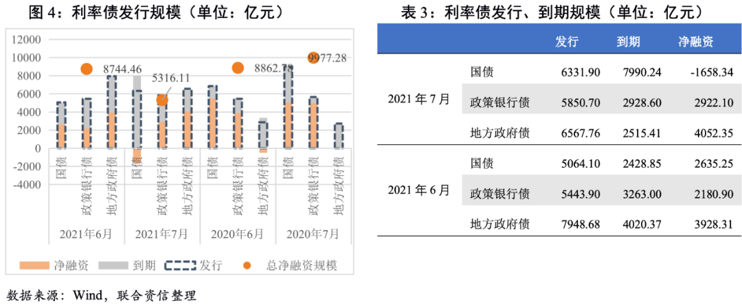 7月,利率債總發(fā)行規(guī)模環(huán)比小幅上升,凈融資規(guī)模環(huán)比繼續(xù)下降,主要是由于7月國(guó)債到期規(guī)模大幅上升;凈融資規(guī)模較上年同期大幅減少。其中,7月國(guó)債發(fā)行規(guī)模創(chuàng)今年最高,預(yù)計(jì)下半年或?qū)⒒謴?fù)往年的供給節(jié)奏。政策性銀行債發(fā)行基本符合歷史發(fā)行節(jié)奏。截至7月底,新增地方政府債發(fā)行進(jìn)度僅為37.11%,顯著慢于2020年及2019年的發(fā)行節(jié)奏,一方面是由于今年專項(xiàng)債額度下發(fā)時(shí)間較晚,另一方面是專項(xiàng)債發(fā)行門檻提高導(dǎo)致項(xiàng)目申請(qǐng)放緩。7月政治局會(huì)議表示“合理把握預(yù)算內(nèi)投資和地方政府債券發(fā)行進(jìn)度,推動(dòng)今年底明年初形成實(shí)物工作量”,表明下半年的發(fā)行或?qū)⑻崴伲饲柏?cái)政部長(zhǎng)劉昆表示“適當(dāng)放寬專項(xiàng)債的發(fā)行時(shí)間限制,合理把握發(fā)行節(jié)奏”,因此預(yù)計(jì)部分專項(xiàng)債發(fā)行將平滑至四季度。整體看,下半年利率債發(fā)行規(guī)模較上半年將有所增加,其中主要是由于專項(xiàng)債發(fā)行規(guī)模上升。