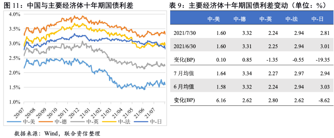 2021年7月,美元兌人民幣匯率基本穩(wěn)定,波動(dòng)區(qū)間在6.45~6.50,人民幣兌美元在7月基本穩(wěn)定,小幅升值0.01%。從基本面看,二季度我國(guó)GDP環(huán)比增速超過(guò)一季度,顯示二季度經(jīng)濟(jì)修復(fù)加速,但并未回到潛在經(jīng)濟(jì)增速以上,德?tīng)査《靖羌哟罅讼掳肽杲?jīng)濟(jì)修復(fù)的不確定性,下半年我國(guó)經(jīng)濟(jì)增長(zhǎng)壓力有所增加,疊加基數(shù)的影響,下半年我國(guó)經(jīng)濟(jì)增速預(yù)計(jì)逐季下行;而美國(guó)隨著疫苗的推廣,經(jīng)濟(jì)有望進(jìn)一步修復(fù),雖然疫情會(huì)擾動(dòng)其修復(fù)進(jìn)程,但美國(guó)經(jīng)濟(jì)修復(fù)峰值到達(dá)將晚于中國(guó),中美經(jīng)濟(jì)修復(fù)周期形成錯(cuò)峰。從貨幣政策端看,7月美聯(lián)儲(chǔ)議息會(huì)議首次討論縮減債券購(gòu)買計(jì)劃,下半年美聯(lián)儲(chǔ)貨幣政策易緊難松。國(guó)家外匯管理局副局長(zhǎng)、新聞發(fā)言人王春英在展望下半年人民幣匯率走勢(shì)時(shí)表示,人民幣匯率還會(huì)存在雙向波動(dòng),但還是會(huì)在合理區(qū)間上保持基本穩(wěn)定。綜合來(lái)看,美元指數(shù)有望進(jìn)一步走強(qiáng),美元兌人民幣匯率或?qū)⒄鹗庂H值,但整體貶值壓力可控。人民幣匯率貶值,可能會(huì)造熱錢流出,外資減持國(guó)內(nèi)債券,但從持有量看外資不是國(guó)內(nèi)債券市場(chǎng)的主導(dǎo)力量,且中國(guó)國(guó)債與其他主要經(jīng)濟(jì)體國(guó)債利差位于相對(duì)較高的位置,我國(guó)國(guó)債仍具有一定的吸引力,因此人民幣匯率貶值對(duì)債市的影響有限。