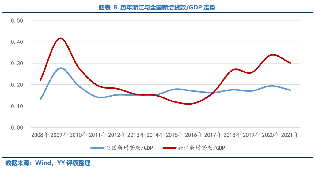 浙江省外向經(jīng)濟(jì)活躍,GNP一度反超GDP,民營、小微經(jīng)濟(jì)高度活躍,為浙江省帶來旺盛的信貸需求,大中小銀行遍地開花,錯位競爭拉動區(qū)域銀行盈利水平。