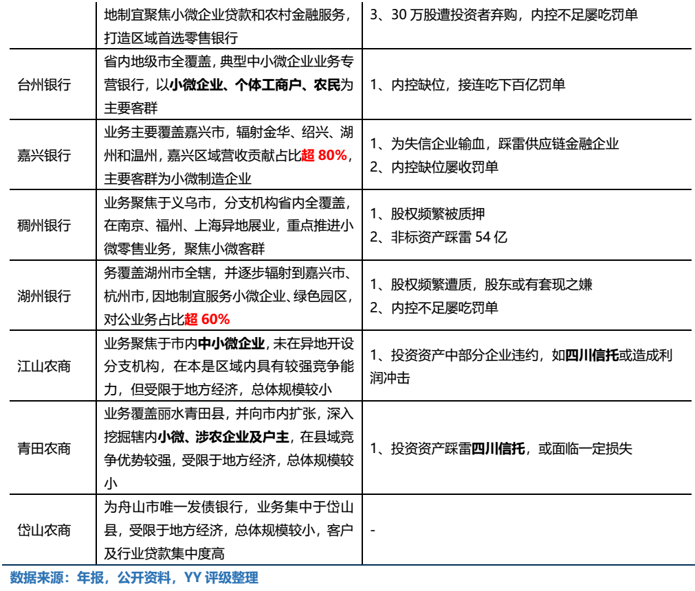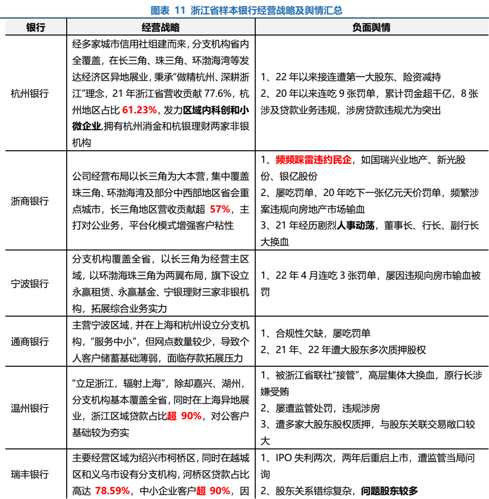 由于浙江的塊狀經(jīng)濟(jì)屬性,樣本行之間表現(xiàn)出差異化特征,上述四個維度分化較大。資產(chǎn)投向方面,有親基建的杭州銀行、有親零售的寧波銀行、亦有親租賃和商務(wù)服務(wù)的通商銀行……但他們都奠基于民營經(jīng)濟(jì),深耕小微客戶。資產(chǎn)質(zhì)量方面,部分銀行不良雖有抬頭傾向,但隨著不良處置力度加大,區(qū)域不良將仍較為可控。盈利能力方面,有盈利翹楚的臺州銀行,有優(yōu)等生寧波銀行,亦有吊車尾的溫州銀行,本地經(jīng)濟(jì)稟賦固然是決定盈利的重要因素,差異化經(jīng)營策略亦是制勝關(guān)鍵。資本充足性方面,樣本行均距監(jiān)管標(biāo)準(zhǔn)有一定安全邊際,高位撥備或能實(shí)現(xiàn)區(qū)域跨越周期。