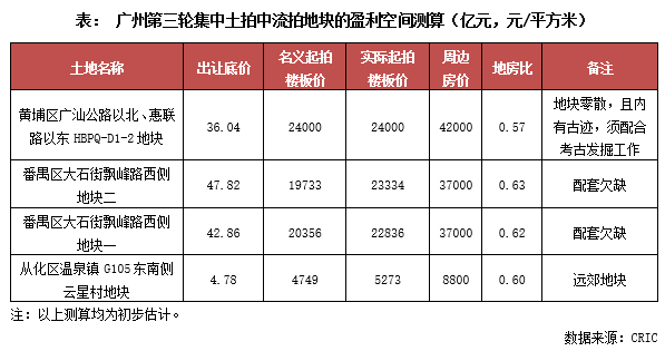 另一方面,利潤空間未及預期也是導致房企參拍意愿不強的原因。雖然廣州此次對部分地塊調低了起拍價格,但出讓地塊的條件仍然較多,實際利潤空間并不是如此充足。以再度流拍的番禺大石街兩宗地塊來看,盡管兩宗地起拍價降幅均在10%以上,但地塊一仍有1.68萬平方米的無償配建和2.42萬平的回購配建要求,地塊二也有5040平方米的無償配建和2.1萬平的回購配建要求,實際起拍樓板價約在2.3萬元/平方米左右;同時,兩宗地周邊城市界面較差,各項配套也比較缺乏,而2公里外臨近地鐵站的新盤售價僅在3.7萬元/平方米。以此價格估算,兩宗地的地房比已經超過0.6,而受配套欠缺影響,兩宗地未來商品住宅價格勢必要更低。由此來看,大石街兩宗地塊的實際盈利空間并不高。因此,本輪這兩宗地無一房企報名參拍,最終而慘遭流拍。