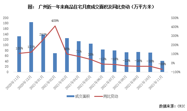 相比于已經完成第三輪土拍的其他城市,廣州此次土拍熱度明顯更冷,也是目前三輪土拍中唯一未有地塊溢價成交的城市。究其原因,一方面主要是由于近月來廣州樓市行情明顯趨冷,此前成交熱點片區南沙、黃埔已經出現了多盤促銷的現象。據CRIC監測數據統計,自今年7月份以來,廣州商品住宅成交量逐月走低,同比降幅也多在三成以上;成交疲軟下,廣州新建商品住宅的消化周期也于11月末上升至15個月,較今年年中時明顯拉長。