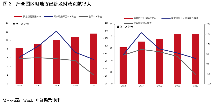 產(chǎn)業(yè)園區(qū)體量持續(xù)壯大,成為地方經(jīng)濟(jì)發(fā)展的主要推動力。產(chǎn)業(yè)園區(qū)開發(fā),一般是在一定的產(chǎn)業(yè)政策和區(qū)域政策的指導(dǎo)下,以土地為載體,通過提供基礎(chǔ)設(shè)施、生產(chǎn)空間(如寫字樓、研發(fā)樓、廠房、倉庫、技術(shù)平臺等)及綜合配套服務(wù),吸引特定類型、特定產(chǎn)業(yè)集群的企業(yè)投資、入駐,形成技術(shù)、知識、資本、勞動力等要素高度集結(jié)并向外圍輻射的特定區(qū)域。在政策、經(jīng)濟(jì)發(fā)展目標(biāo)的持續(xù)推動下,各地產(chǎn)業(yè)園區(qū)發(fā)展迅速,數(shù)量持續(xù)增長。隨著產(chǎn)業(yè)園區(qū)開發(fā)力度的加強(qiáng)及資源的整合和優(yōu)化,園區(qū)產(chǎn)值等多項(xiàng)經(jīng)濟(jì)指標(biāo)顯著向好變化,增長速度高于全國整體經(jīng)濟(jì)增長水平,在地方城鎮(zhèn)化和工業(yè)化進(jìn)程中扮演著重要的角色。