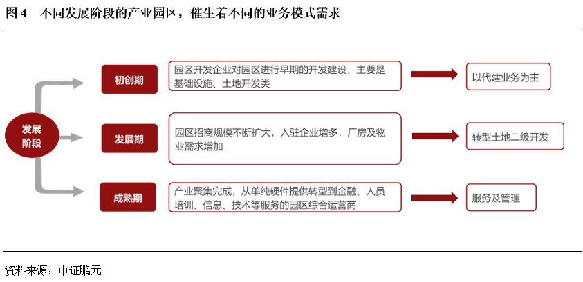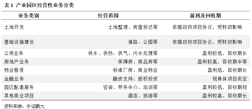 不同發(fā)展階段的產(chǎn)業(yè)園區(qū),催生著不同的業(yè)務(wù)模式需求。一般而言,因?yàn)榈貐^(qū)資源稟賦、經(jīng)濟(jì)發(fā)展水平的不同,產(chǎn)業(yè)園區(qū)存在著初創(chuàng)期、發(fā)展期、成熟期等不同的發(fā)展階段。對于初創(chuàng)期的園區(qū)開發(fā)業(yè)務(wù),圍繞政府產(chǎn)業(yè)規(guī)劃、招商引資政策,集中在基礎(chǔ)設(shè)施代建、土地開發(fā)整理等方面,收益主要源自于政府的代建收入,市場化程度不高。隨著園區(qū)入駐企業(yè)的增多,廠房、物業(yè)需求增加,城投公司逐步拓展至相關(guān)產(chǎn)業(yè)地產(chǎn)開發(fā)業(yè)務(wù),如標(biāo)準(zhǔn)廠房、公寓、商業(yè)寫字樓等建設(shè),收益主要源自于物業(yè)出售、租賃等。最終在產(chǎn)業(yè)聚集完成后,園區(qū)步入成熟階段,入駐企業(yè)的各項(xiàng)金融、信息、技術(shù)服務(wù)需求增加,城投公司以服務(wù)和管理為收益來源的業(yè)務(wù)將會增長。