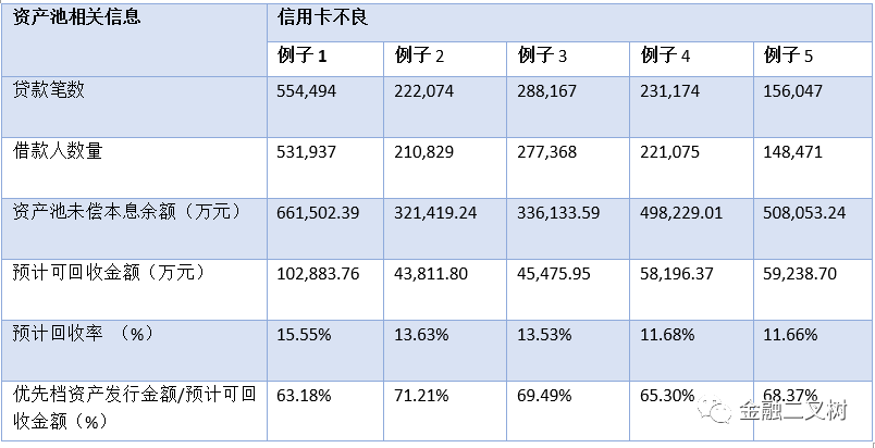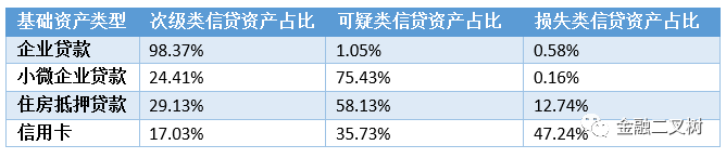 不良ABS根據(jù)基礎(chǔ)資產(chǎn)不同可以分為信用卡類、企業(yè)貸款類、小微企業(yè)貸款類、住房抵押貸款類、個人汽車貸款類、一般消費貸款類和混合貸款類。在這幾種資產(chǎn)中信用卡類是被認為分散度最高的,這是由于信用卡類客戶以及貸款性質(zhì)決定的,這類ABS入池貸款筆數(shù)相較其他類ABS是最多的,每筆規(guī)模也普遍較小,以下表為例: