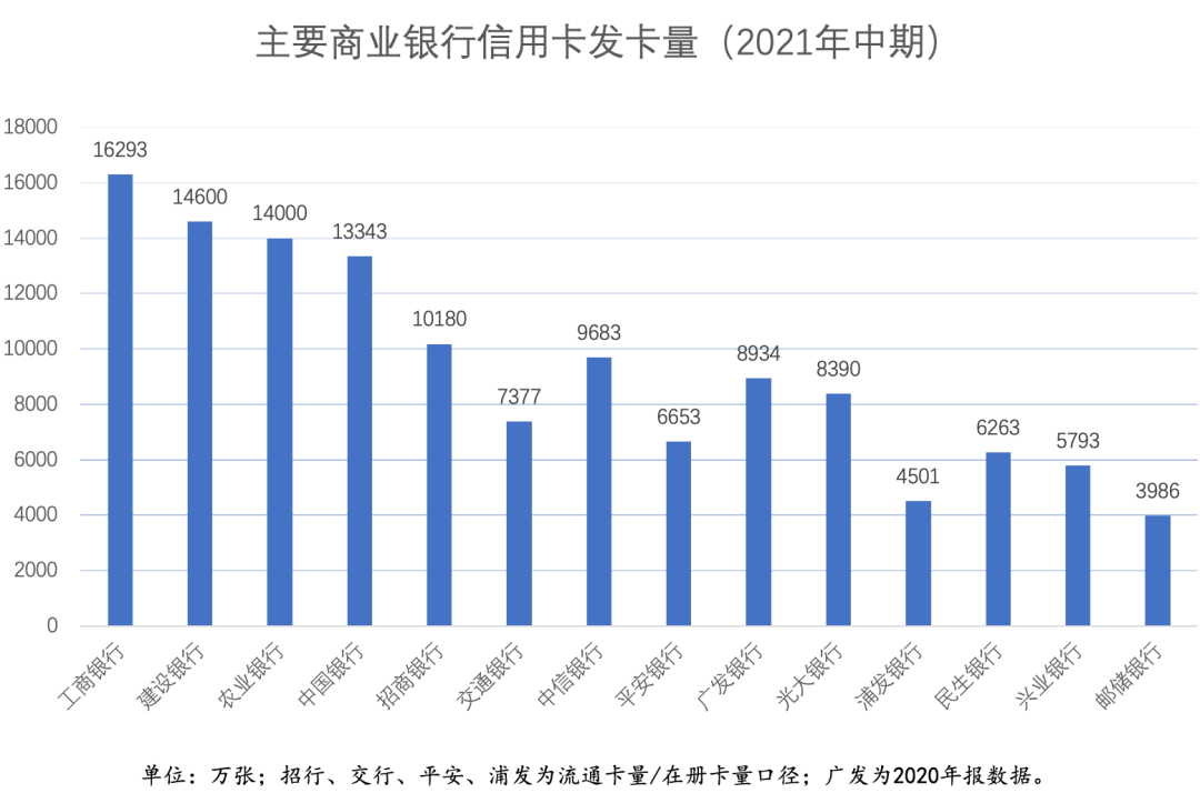 截至2021年6月末,該行信用卡流通卡量達6,652.74萬張,較上年末增長3.6%。按照常見的70%左右的流通卡量/累計發卡量比重測算,平安信用卡的累計發卡量大概率在9000萬張以上。