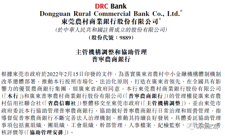 (一)2022年2月16日,港股上市銀行東莞農(nóng)商行(9889.HK)發(fā)布公告明確,根據(jù)2022年2月15日東莞市政府印發(fā)的文件,東莞農(nóng)商行與普寧農(nóng)商行的管理權(quán)從廣東省聯(lián)社整體移交至東莞市政府,同時東莞市政府委托東莞農(nóng)商行協(xié)助管理普寧農(nóng)商行。考慮到之前的廣州農(nóng)商行與深圳農(nóng)商行亦已脫離廣東省聯(lián)社管理,這意味著繼直轄市方案(即單一銀行模式)、浙江方案(即聯(lián)合銀行模式)、陜西與寧夏方案(即銀行控股模式)之后,廣東省聯(lián)社的方案(即金融服務(wù)模式)也基本得以明確,充分體現(xiàn)出“一省一策”的改革思路。