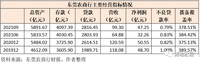 截至2021年9月,東莞農(nóng)商行的總資產(chǎn)達到5891.67億元,不良貸款率與撥備覆蓋率分別為0.79%與378.51%。目前東莞農(nóng)商行按總資產(chǎn)排序位居第五大農(nóng)商行,低于重慶農(nóng)商行、上海農(nóng)商行、北京農(nóng)商行、廣州農(nóng)商行。