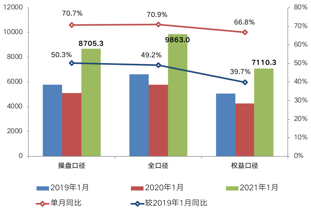 從房企方面來看,2021年1月百強房企單月操盤銷售8705.3億元,同比增長70.7%,這主要是由于去年1月正值春節假日,1月15日之后基本進入春節前的銷售停滯期,而今年2月才進入春節假期,房企推盤銷售月度節奏較為完整,再加上去年新冠疫情的爆發,返鄉置業幾乎停擺,在去年整體成交基數較低的情況下,今年增長明顯。