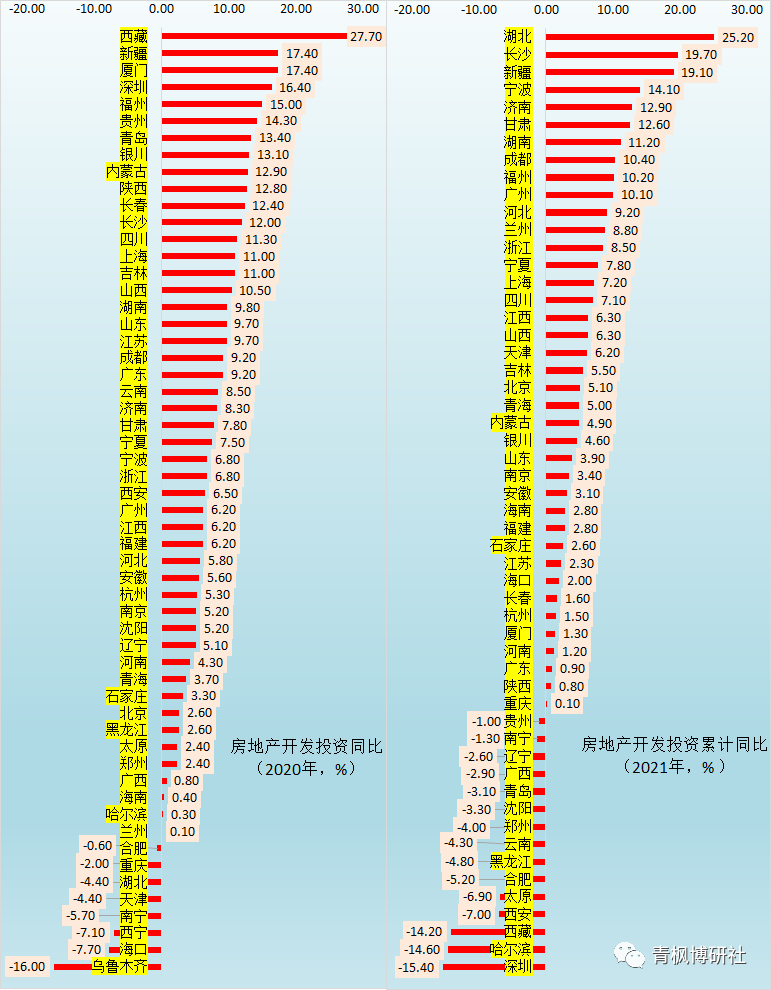 (一)從房地產開發投資同比來看,西藏、西安、太原、合肥、黑龍龍江、云南、鄭州、沈陽、青島等地下滑同樣比較大。2021年前三季度,鄭州地產開發投資同比下降4%,但如果從全年數據來看,則可能更糟心,這大概也是鄭州大幅放松地產調控的原因。