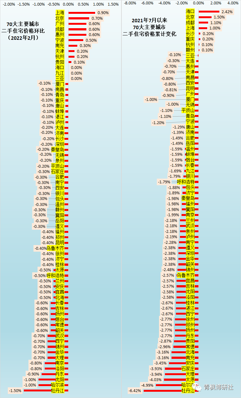 (二)從房價變化來看,2022年2月當月,70大城市中有57個城市的二手住宅價格環比出現了下降,23個城市下降幅度超過0.50%,沈陽、哈爾濱、牡丹江等三個東北城市的下降幅度均超過1%。當然,若從2021年7月以來的6個月累計下降幅度來看,70個大中城市中的62個城市二手住宅價格出現了下降,牡丹江、哈爾濱、太原、大理、石家莊、安慶、南充、北海等城市的二手住宅價格累計下降幅度均超過3%,其中哈爾濱與牡丹江分別下降6.42%和4.99%。