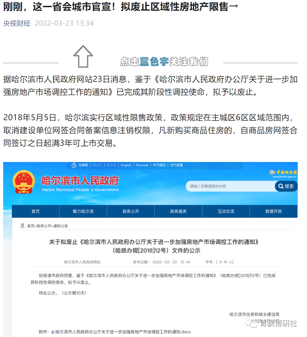 (一)地產行業風險仍在持續釋放的背景下,因城施策的各地動向備受關注。2022年3月23日,哈爾濱市住建局在哈爾濱市政府官網披露的信息顯示,經報請市政府同意,鑒于《哈爾濱市人民政府辦公廳關于進一步加強房地產市場調控工作的通知》(哈政辦規(2018)12號)已完成其階段性調控使命,擬予以以廢止。值得關注的是,哈爾濱此舉,隨后得到經濟日報、央視財經等官媒的轉載。
