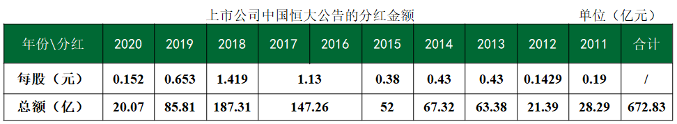 假使從上市公司股東的角度統計,過去十年,作為上市公司的中國恒大公告的分紅總額也超過672.83億。