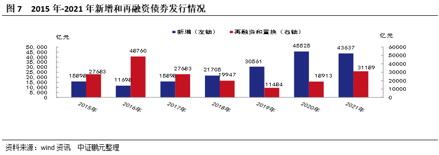 2021年,新增債券共發行1,544只,同比增長0.32%,占地方債發行之比為77.5%,發行規模為43,637.09億元,同比下降4.15%,占地方債發行之比為41.7%。其中,新增一般債券發行164只,規模7,832.46億元,去年新增一般債券限額8,200億元,已發行占比95.52%。新增專項債券發行1,380只,規模35,804.64 億元,去年新增專項債券限額36,500億元,已發行占比98.09%。2021年經全國人大批準,預算安排新增地方政府債務限額44,700億元,到年底新增債券規模還剩1,062.91億元。再融資債券共發行447只,同比增長44.66%,占地方債發行之比為22.5%,發行規模為31,189.21億元,同比增長64.91%,占地方債發行之比為58.3%。2021年下半年,為了應對經濟下行態勢,新增債券發行明顯提速,新增債券發行出現大幅上升。下半年,新增債券共發行1,117只,同比增長81.04%,發行規模為28,837.29億元,同比上升63.33%。