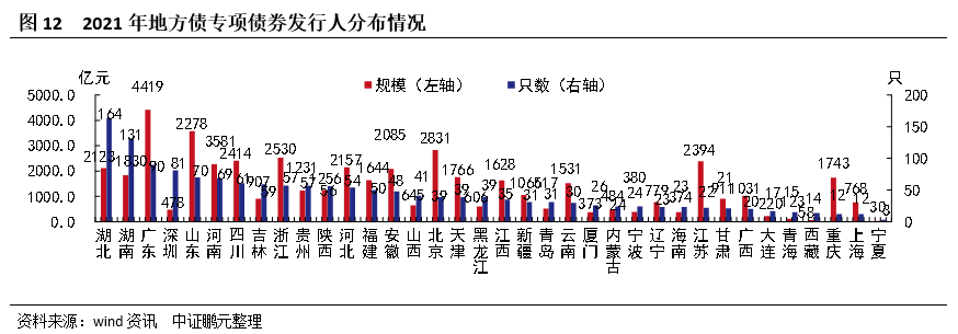 從債券類型來看,2021年一般債券發行只數以湖北居首,共發行了32只,其次為北京,發行19只,再者為廣東,發行17只,發行規模居前三位的省份為廣東、山東和江蘇,規模分別為1,733.07億元、1,328.79億元和1,308.01億元;專項債券發行只數居前三位的省份為湖北、湖南和廣東,分別為164只、131只和90只,發行規模居前三位的省份為廣東、山東和北京,規模分別為4,418.69億元、3,581.37億元和2,831.21億元。