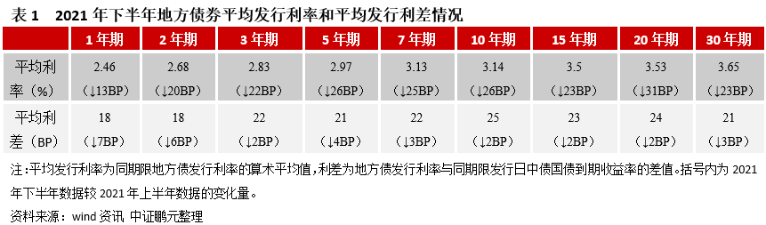 1、發行利率整體下行。2021年下半年地方債平均發行利率為3.29%,較2021年上半年下行超過19BP,主要是市場利率整體下行因素的影響。具體來看,1年期為2.46%,下行13BP;2年期為2.68%,下行20BP;3年期為2.83%,下行22BP;5年期為2.97%,下行26BP;7年期為3.13%,下行25BP;10年期為3.14%,下行26BP;15年期為3.5%,下行23BP;20年期為2.53%,下行31BP;30年期為3.65%,下行23BP。