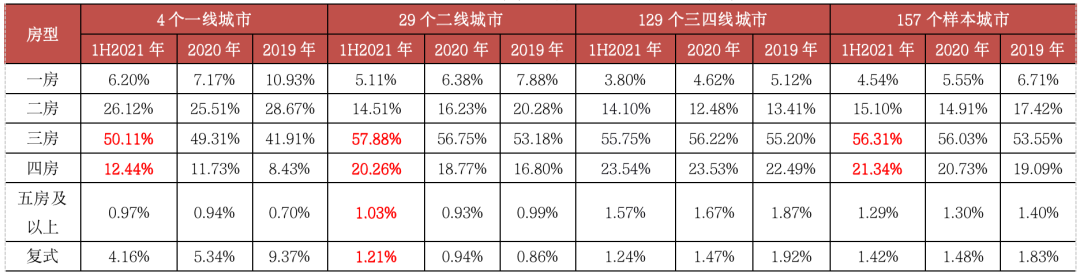 一線城市三房、四房占比持續(xù)提升。2021年上半年,一線城市三房戶型成交占比50.11%,較2020年再增0.8個(gè)PTS;四房成交占比12.44%,較2020年再增0.71個(gè)PTS。