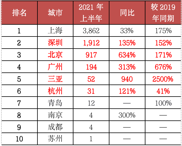 157城單價(jià)10萬(wàn)元/平方米以上頂豪累計(jì)成交7051套,同比增長(zhǎng)81%,較2019年同期增長(zhǎng)175%。