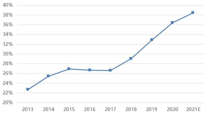 2、居民人均可支配收入增速在2020年顯著下滑,由前一年9%左右下滑至當(dāng)年5%左右。預(yù)計(jì)2021年仍將保持低位。國(guó)家統(tǒng)計(jì)局2019年及以后已不再公布可支配收入總量數(shù)據(jù),但歷史上可支配收入占GDP比重非常穩(wěn)定,在56-60%之間,去年由于GDP增速低于人均可支配收入增速,估算可支配收入占GDP比重略高于60%。