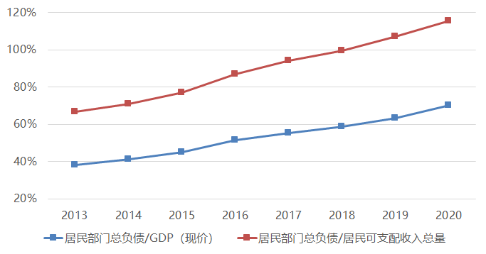 居民部門(mén)總負(fù)債與GDP/居民可支配收入總量的比值(2013年-2020年)