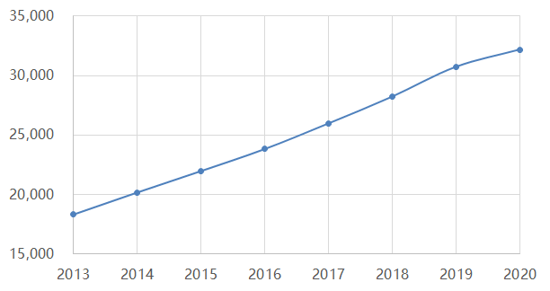 居民可支配收入總量數(shù)據(jù)從2018年以后已不再公布,但仍在持續(xù)公布人均可支配收入數(shù)據(jù)。2018年之前的過(guò)去數(shù)年,居民可支配收入占GDP比重比例較為穩(wěn)定,人均可支配收入與人口數(shù)乘積(居民可支配收入計(jì)算值)相比國(guó)家統(tǒng)計(jì)局公布的居民可支配收入總量的比例也相對(duì)穩(wěn)定。因此筆者采用了二者取其一,利用另一者校驗(yàn)的方法進(jìn)行居民可支配收入總量數(shù)據(jù)的假設(shè)測(cè)算;
