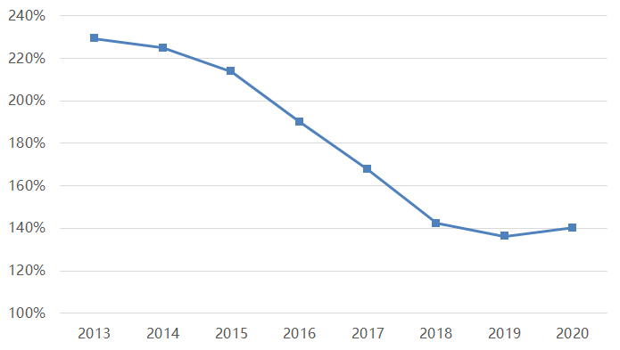 (居民存款+零售理財(cái)總值)/居民部門(mén)金融負(fù)債總值(2013年-2020年)