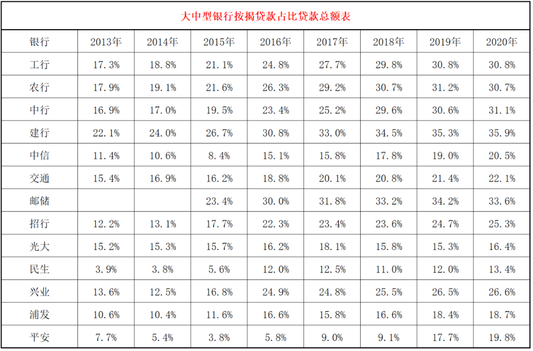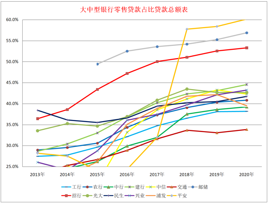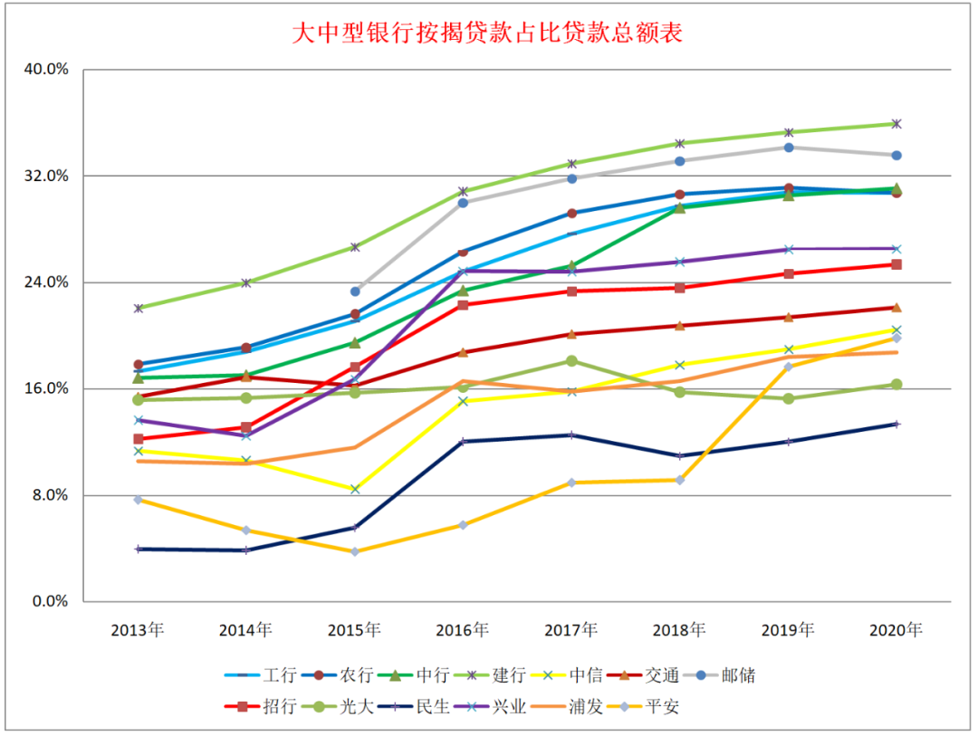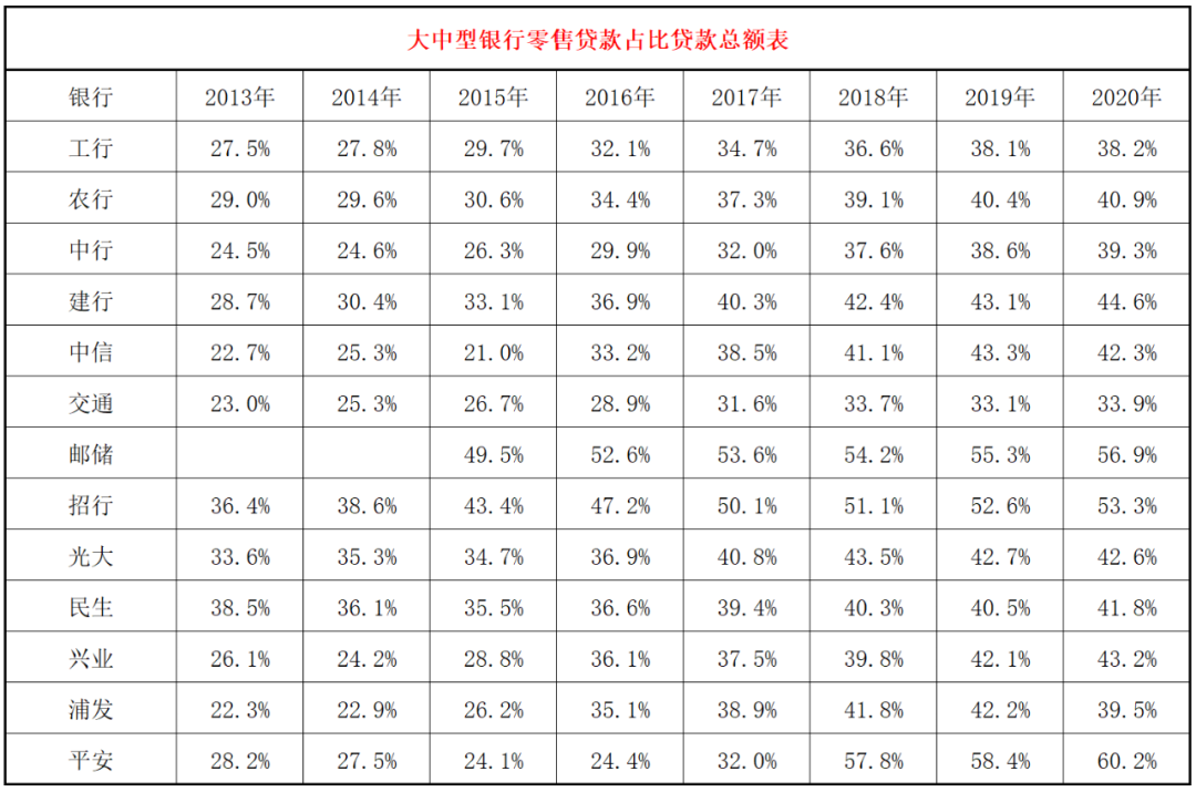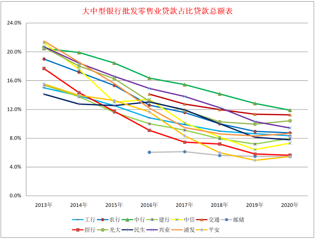 我們統(tǒng)計了13家大中型銀行過去八年貸款與總資產(chǎn)的占比、零售貸款與貸款總額的比值,制造業(yè)貸款與貸款總額的比值,批發(fā)零售業(yè)貸款與貸款總額的比值,按揭貸款與貸款總額的比值。