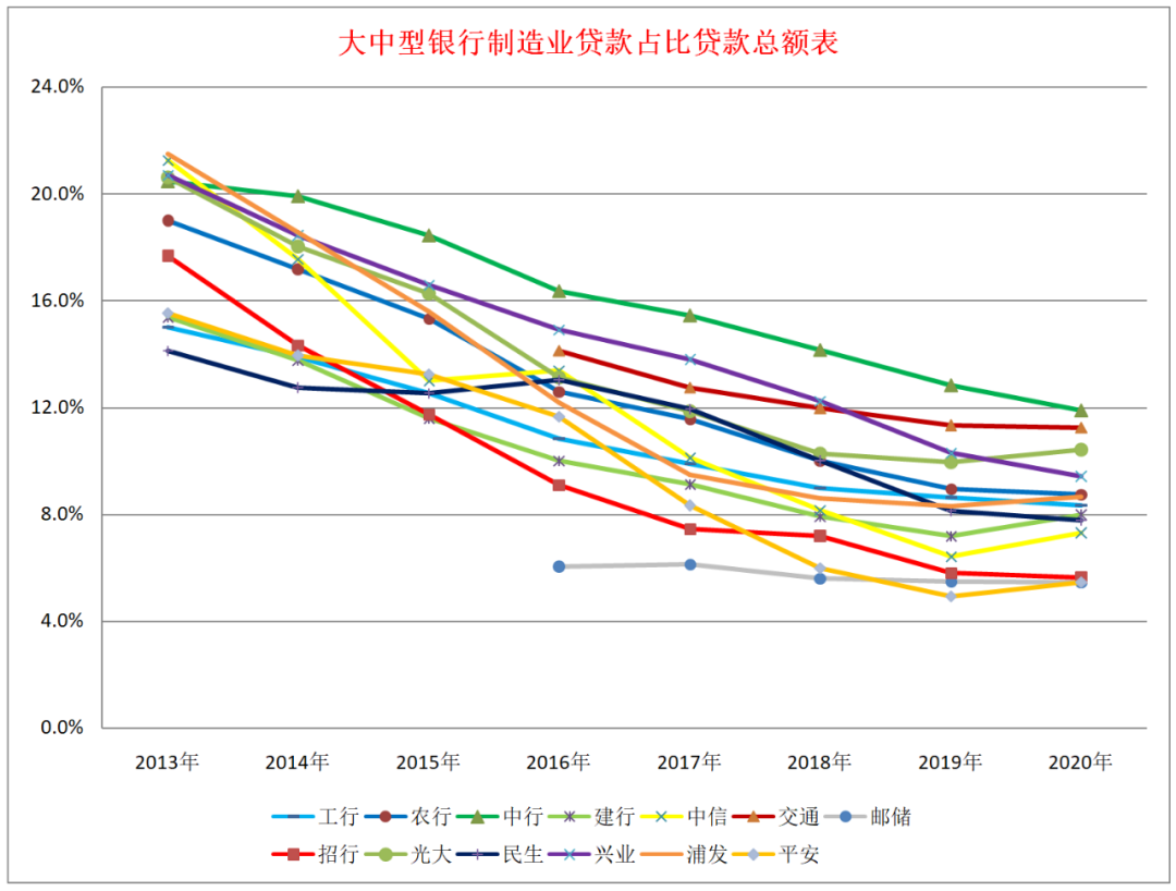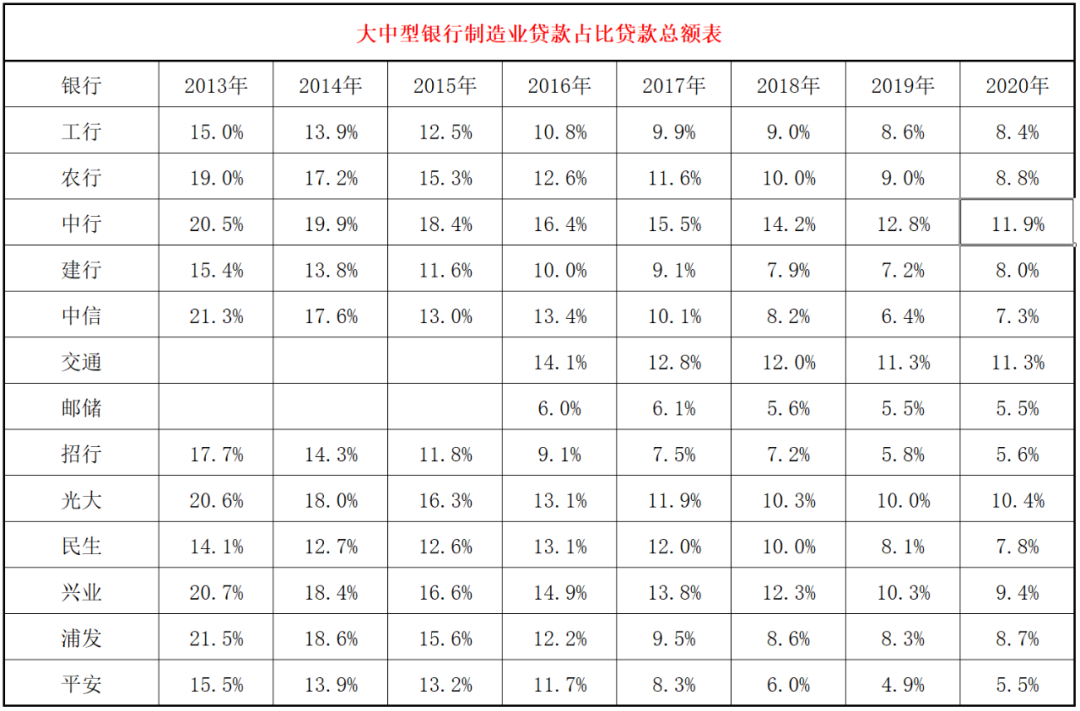 4、制造業(yè)貸款占比情況。中國的制造業(yè)是全球的王者,激烈的競爭也決定了很多企業(yè)生存非常艱難,集團企業(yè)平均壽命7年,中小企業(yè)平均壽命不到3年,能從銀行貸款的制造業(yè)企業(yè)按理并不差,但從歷年各家銀行的財報看,除掉核銷的不良,公布的不良率有不少接近10%甚至超過10%,憑這些年對數(shù)據(jù)的觀察,制造業(yè)貸款應該會有20%會是壞賬,也就是貸款出去1個億,應該有2000萬壞賬,幾個點的利息完全覆蓋不了不良,制造業(yè)高的企業(yè)需要多一份謹慎。制造業(yè)貸款從2013年占比18%壓縮到現(xiàn)在占比8%,這里面壓縮最堅決最快最早的是招商銀行,招商銀行2016年制造業(yè)貸款就壓縮到10%以下,其他銀行都在10%以上,那兩三年也是招商銀行不良集中爆發(fā)的時期,現(xiàn)在壓縮到只有5%。后來中信銀行也壓縮的非常猛,從21%壓縮到6%,結(jié)果行長被抓第一條理由就是壓縮制造業(yè)過猛。對于中國銀行,制造業(yè)一直占比比較高,但是中國銀行新生不良一直很低,在四大行也是最低的,多少還是有點存疑,工農(nóng)建三家都是中規(guī)中矩慢慢的壓縮。