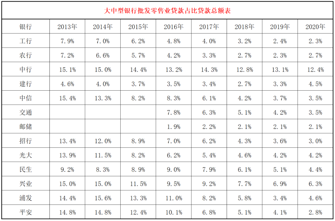 5、批發(fā)零售業(yè)貸款占比情況。批發(fā)零售業(yè)一直都是死亡率最高的行業(yè),商業(yè)服務業(yè)能做長久的太少了,而且這些年互聯(lián)網(wǎng)對其沖擊非常大,從銀行披露的財報數(shù)據(jù)看,不良率是僅次于制造業(yè)的,實際不良率超過10%是沒有懸念。2013年批發(fā)零售業(yè)貸款平均占比為12%,到2020年平均占比只有4%。招商銀行依然是那個跑的最快最堅決最靚的仔,從13%壓到3%,中信銀行、平安銀行都是壓縮比較狠的,其實中信銀行被抓的那個行長對中信銀行是有功的,中信銀行2020年業(yè)績好于浦發(fā)銀行、光大銀行、民生銀行還是有一些原因的。最不可思議的依然是中國銀行,依然堅挺占比12%,和制造業(yè)一樣保持較高,然后這些年的新生不良還很少,這一點一直讓我困惑。