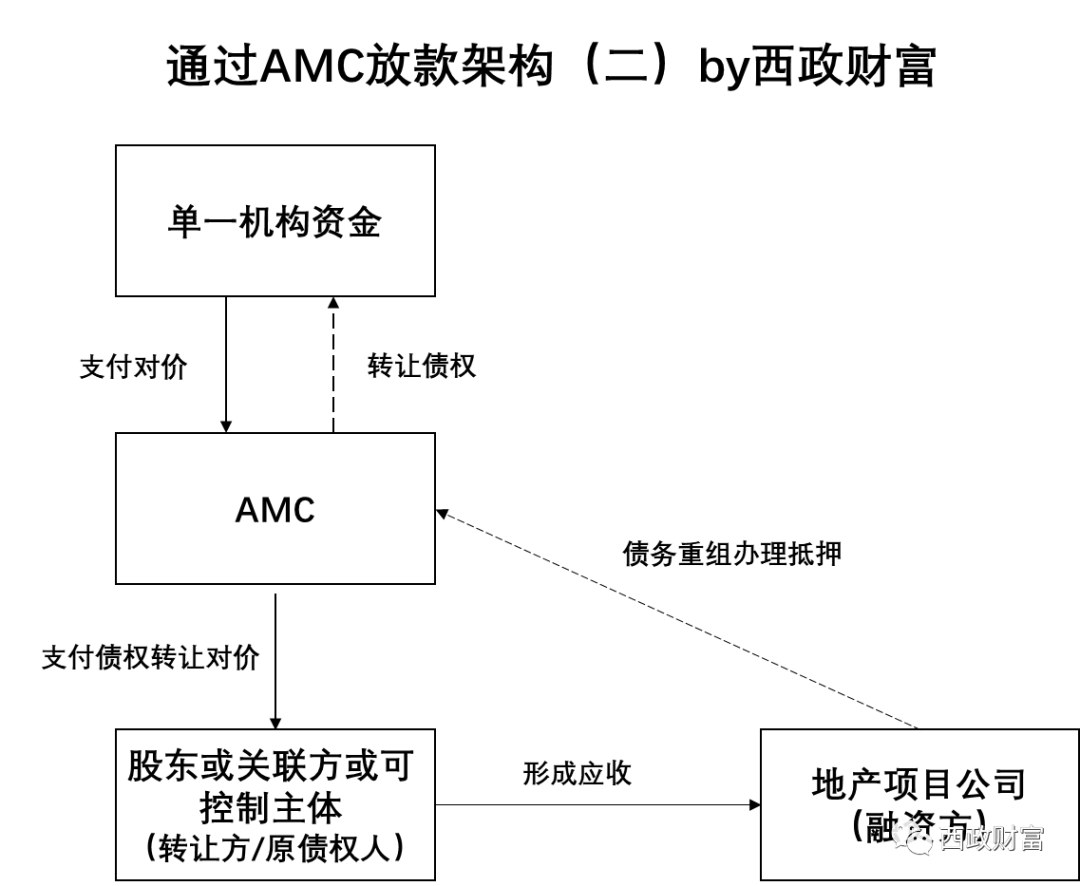 1.通過AMC放款實質(zhì)為資金方不直接放貸給融資方,而是通過AMC購買融資方作為債務(wù)人的債權(quán),債權(quán)中附帶抵押權(quán),即可以將AMC理解為類似銀行委貸角色;