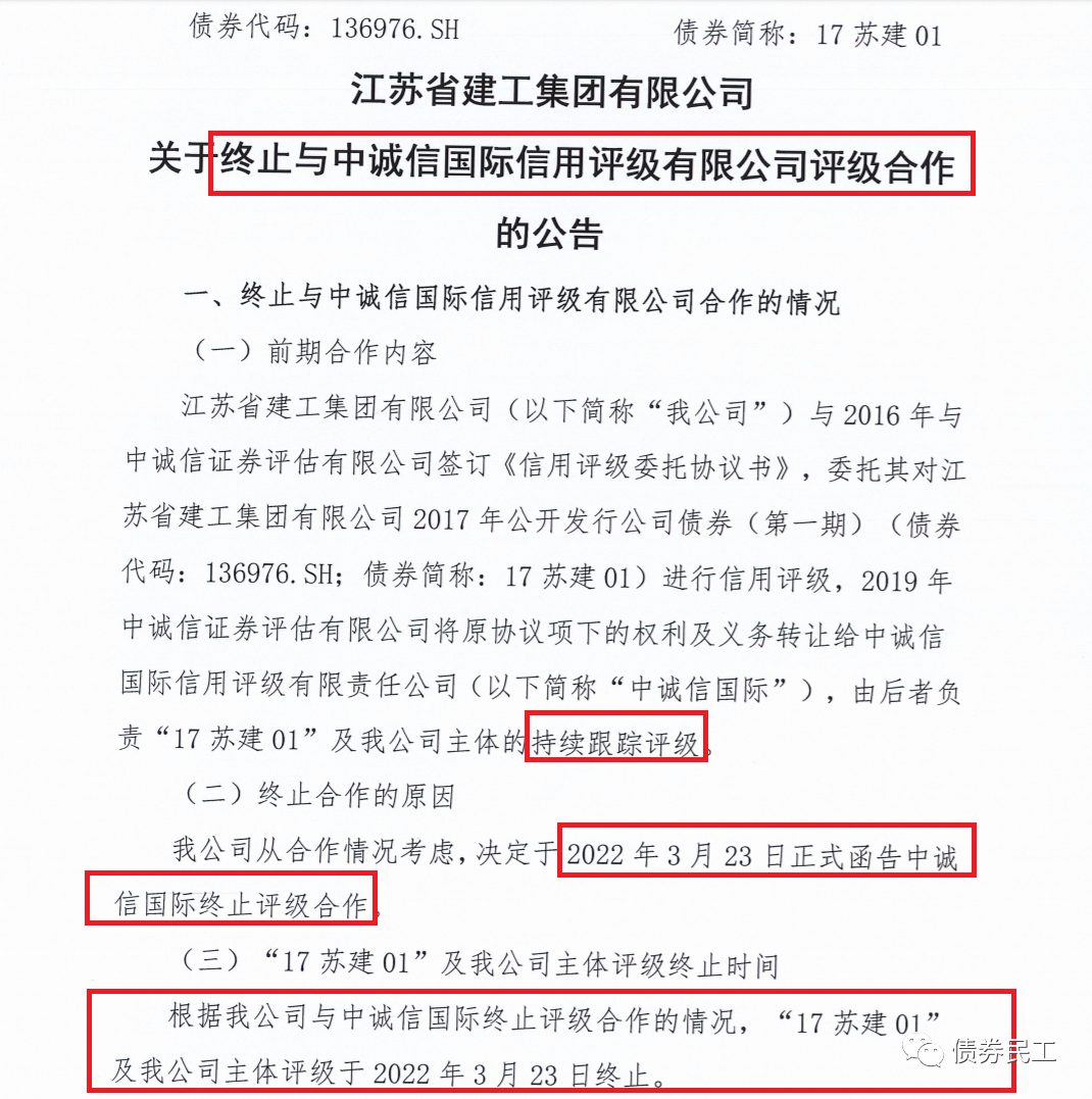 根據江蘇省建工集團有限公司2022年3月28日披露的公告信息,公司決定在“17蘇建01”債券上終止與中誠信國際評級有限公司的評級合作,終止合作的時間是2022年3月23日。