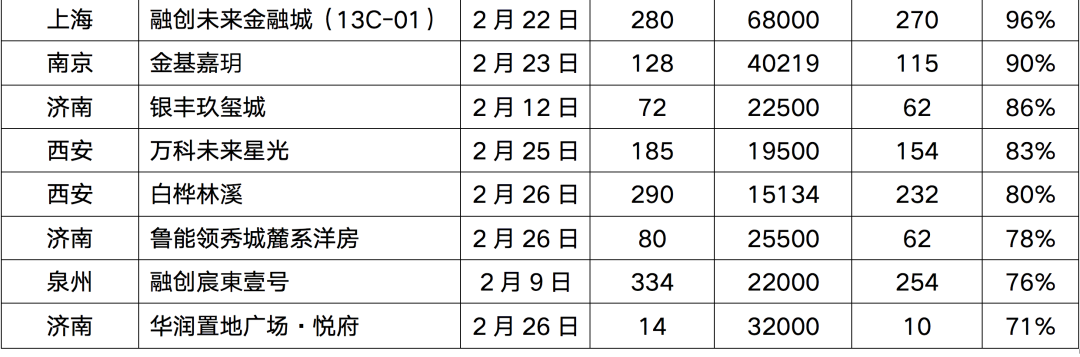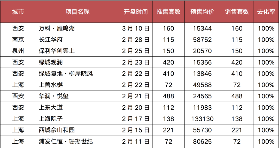 從CRIC監測的2月以來不同城市去化率大于70%的19個項目來看,一線城市上海占5席;而基本面良好的內陸二線城市西安有7個項目去化大于70%,去化達到100%的項目就有5個。此外,東南沿海核心二三線城市泉州表現亮眼。