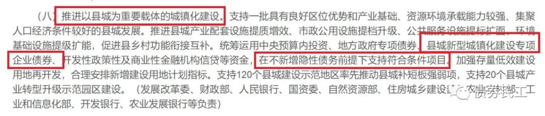 2022年3月17日,國家發(fā)展改革委印發(fā)《2022年新型城鎮(zhèn)化和城鄉(xiāng)融合發(fā)展重點(diǎn)任務(wù)》的通知(發(fā)改規(guī)劃[2022]371號(hào)),明確提出“統(tǒng)籌運(yùn)用中央預(yù)算內(nèi)投資、地方政府專項(xiàng)債券、縣城新型城鎮(zhèn)化建設(shè)專項(xiàng)企業(yè)債券、開發(fā)性政策性及商業(yè)性金融機(jī)構(gòu)信貸等資金,在不新增隱性債務(wù)前提下支持符合條件項(xiàng)目”。縣城新型城鎮(zhèn)化建設(shè)專項(xiàng)企業(yè)債券是助力縣城城鎮(zhèn)化的重要資金渠道,能夠?yàn)轫?xiàng)目建設(shè)提供有效的資金支持。當(dāng)然,使用的前提是不能新增隱性債務(wù)。