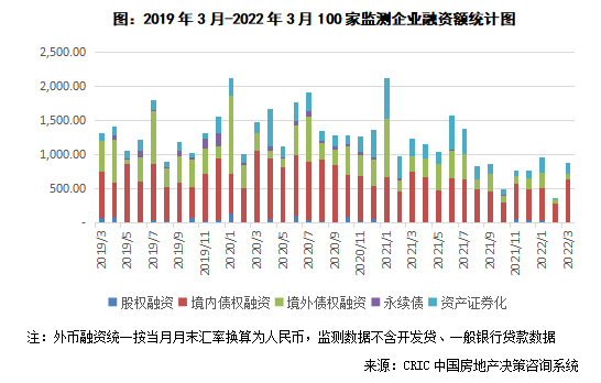 2022年3月100家典型房企的融資總量為878.39億元,環(huán)比上升138.7%,同比下降29.1%。融資量環(huán)比有較大的增長(zhǎng),同比降幅收窄,主要在于年初政策暖風(fēng)頻吹,3月六部委又就房地產(chǎn)問(wèn)題進(jìn)行發(fā)聲,促進(jìn)房地產(chǎn)業(yè)良性循環(huán)和健康發(fā)展,促進(jìn)企業(yè)融資恢復(fù)。從融資結(jié)構(gòu)來(lái)看,境內(nèi)債權(quán)融資641.18億元,環(huán)比上升125.2%,同比下降15.0%;境外債權(quán)融資72.93億元,環(huán)比上升27.6%,同比下降65.7%;本月資產(chǎn)證券化融資164.28億元,環(huán)比上升526.8%,同比下降39.6%,大部分是國(guó)企央企,融資意愿有所上升。