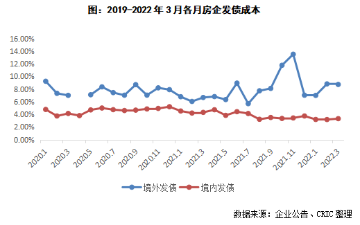2022年3月100家典型房企新增債券類(lèi)融資成本4.35%,環(huán)比上升0.54pct,同比下降0.62pct。其中境內(nèi)融資成本3.30%,環(huán)比上升0.13pct,本月有更多的企業(yè)進(jìn)行了境內(nèi)發(fā)債,上實(shí)城市開(kāi)發(fā)、首開(kāi)股份、金融街、旭輝集團(tuán)等加入了發(fā)債隊(duì)伍;境外融資成本8.72%,環(huán)比下降0.09pct。2021年截至3月100家典型房企新增債券類(lèi)融資成本4.50%,較2021年下降0.78個(gè)百分點(diǎn),其中境外債券融資成本達(dá)7.54%,上升0.52個(gè)百分點(diǎn),境內(nèi)債券融資成本3.23%,較2021年下降0.83個(gè)百分點(diǎn)。