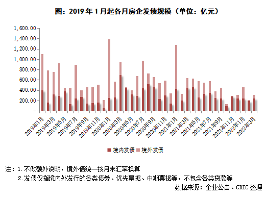 3月發(fā)債315.4億元,環(huán)比上升44.5%,同比下降50.5%。其中,境外發(fā)債72.9億元,環(huán)比上升195.1%,同比下降59.9%,本月景瑞控股完成了1.71億美元優(yōu)先票據(jù)的交換要約,以及正榮地產(chǎn)完成了7.29億美元和15.9億元人民幣優(yōu)先票據(jù)的交換要約發(fā)行。境內(nèi)發(fā)債242.5億元,環(huán)比上升25.3%,同比下降46.8%,其中,公司債發(fā)行45.9億元,環(huán)比上升6.74%,同比下降78.3%;中期票據(jù)發(fā)行117.6億元,環(huán)比下降11.8%,同比下降4.9%;融資券發(fā)行79.0億元,環(huán)比上升359.3%,同比下降34.2%。境內(nèi)發(fā)債主體仍以國(guó)企央企為主,民營(yíng)房企中,萬(wàn)科和旭輝分別發(fā)行了19.9億元的公司債和10億元的中期票據(jù)。