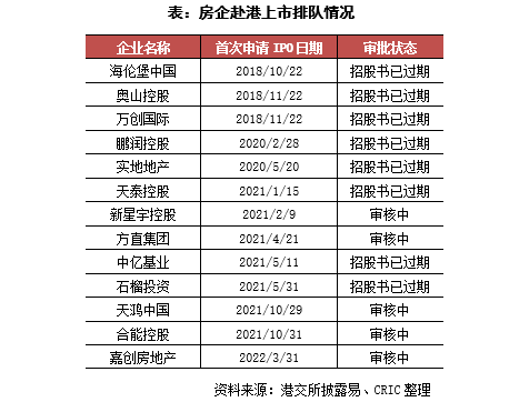 本月廣東房企嘉創(chuàng)房地產(chǎn)首次向港交所遞交招股說(shuō)明書(shū),新星宇控股則在3月17日再次更新了招股書(shū),因此截至2022年3月底,在港交所在遞交過(guò)招股書(shū)但仍未成功上市的房企為13家,其中有8家房企在招股書(shū)過(guò)期后都沒(méi)有更新招股書(shū),未來(lái)是否會(huì)繼續(xù)上市進(jìn)程還有待觀察。