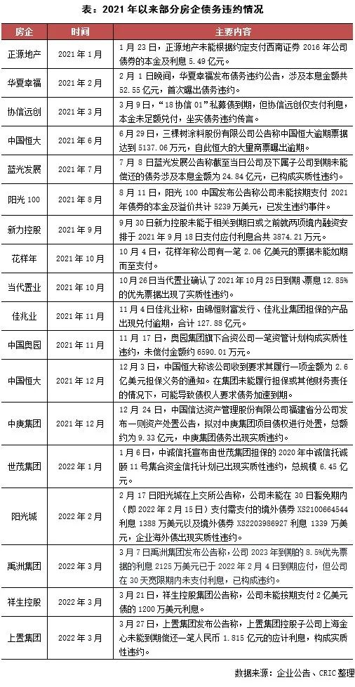 在債務(wù)違約方面,本月7日、21日和27日禹洲集團(tuán)、祥生控股和上置集團(tuán)分別發(fā)布公告稱(chēng)旗下債券未能按期支付利息,構(gòu)成了實(shí)質(zhì)性違約,單月曝出債務(wù)違約的房企數(shù)量是2021年以來(lái)之最,未來(lái)仍有可能有更多房企曝出債務(wù)違約事件。