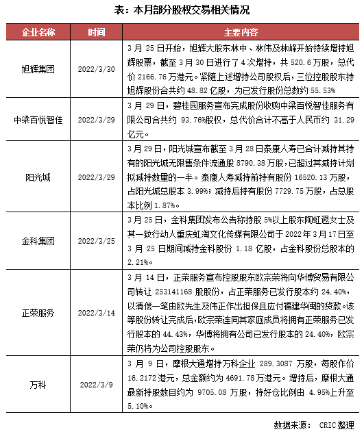 本月有多家大型房企出現(xiàn)了股權(quán)變動(dòng),包括旭輝大股東在25日之后對(duì)公司股份的連續(xù)增持,陽(yáng)光城股東泰康人壽繼續(xù)減持計(jì)劃,以及摩根大通對(duì)萬(wàn)科的增持等。除此之外比較值得注意的是物管企業(yè)股權(quán)的變動(dòng):碧桂園服務(wù)完成了對(duì)中梁旗下物業(yè)公司中梁百悅智佳93.76%股權(quán)的收購(gòu),總代價(jià)不超過(guò)31.29億元;正榮服務(wù)大股東為了清償貸款將公司24.40%的股權(quán)轉(zhuǎn)讓給華博貿(mào)易。整體看來(lái),本月由于部分房企流動(dòng)性問(wèn)題的影響,物管行業(yè)出現(xiàn)了一定的收并購(gòu)機(jī)會(huì),因此碧桂園服務(wù)這樣的龍頭物企仍在繼續(xù)出手進(jìn)行收并購(gòu),同時(shí)部分房企也有以旗下物業(yè)股權(quán)清償負(fù)債的舉動(dòng)。