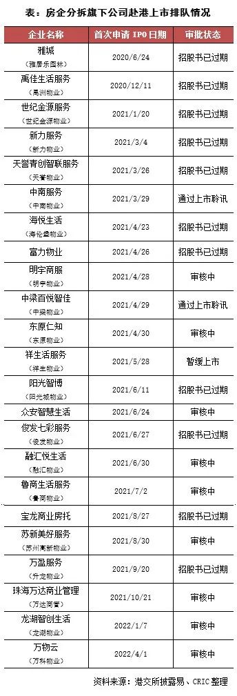 在房企分拆旗下公司上市方面,期后萬(wàn)科旗下的物業(yè)服務(wù)公司萬(wàn)物云在4月1日正式向港交所申請(qǐng)上市,此外融匯悅生活和蘇新美好服務(wù)分別在3月21日和4月4日更新了招股書(shū),因此截至2022年4月6日,在港交所遞交過(guò)招股書(shū)而仍未上市的房企旗下公司共有23家,其中有多家企業(yè)的招股書(shū)都已過(guò)期,未來(lái)是否還會(huì)堅(jiān)持上市有待觀察。